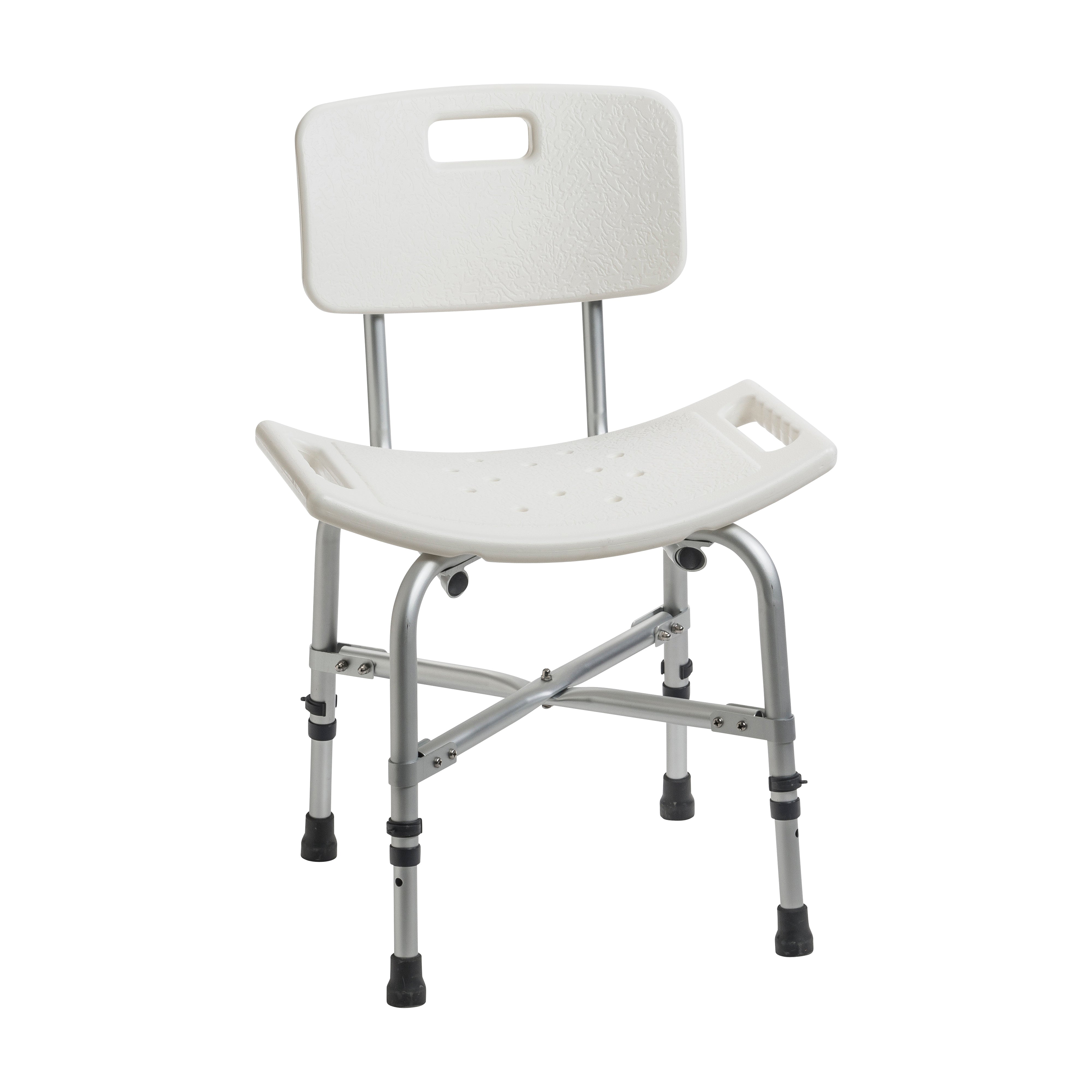 With a 500-pound weight capacity, this bariatric shower chair from Drive Medical is strong and sturdy. A cross brace attached with aircraft-style rivets provides dependable strength. The blow molding on the back and seat are contoured to provide extra comfort. Drainage holes in the seat reduce pooling water to prevent slipping, while adjustable height legs ensure a proper fit. The aluminum frame is lightweight, durable, and corrosion-proof.