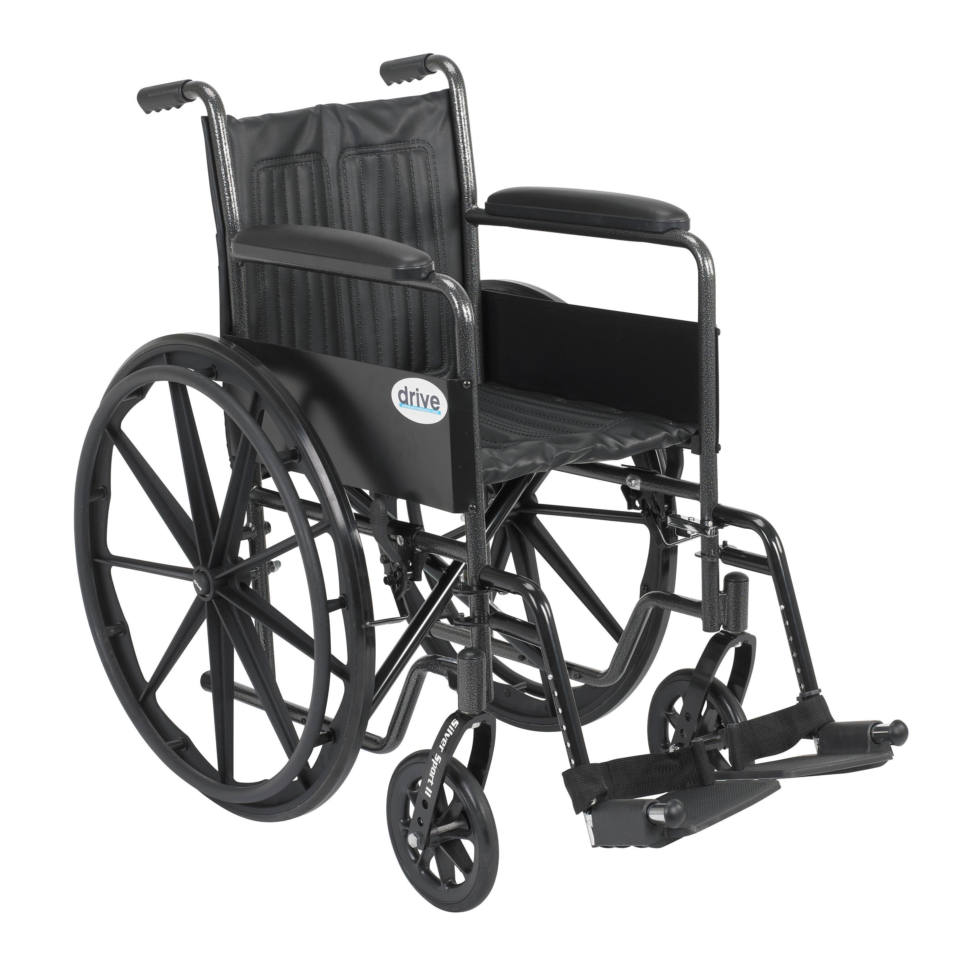 The 18" Silver Sport 2 Wheelchair with Fixed Arms and Swing Away Footrests by Drive Medical comes in an attractive, easy to maintain, powder coated, silver vein finish, and a steel frame for durability. The urethane tires are mounted on composite wheels to provide durability and a smooth ride over most surfaces. The embossed, nylon upholstery is durable, lightweight, attractive and easy to clean. The carry pocket on the backrest provides an easy and safe way to transport personal items. Comes standard with swing away footrests, padded fixed arms, push to lock brakes and plastic footplates.
